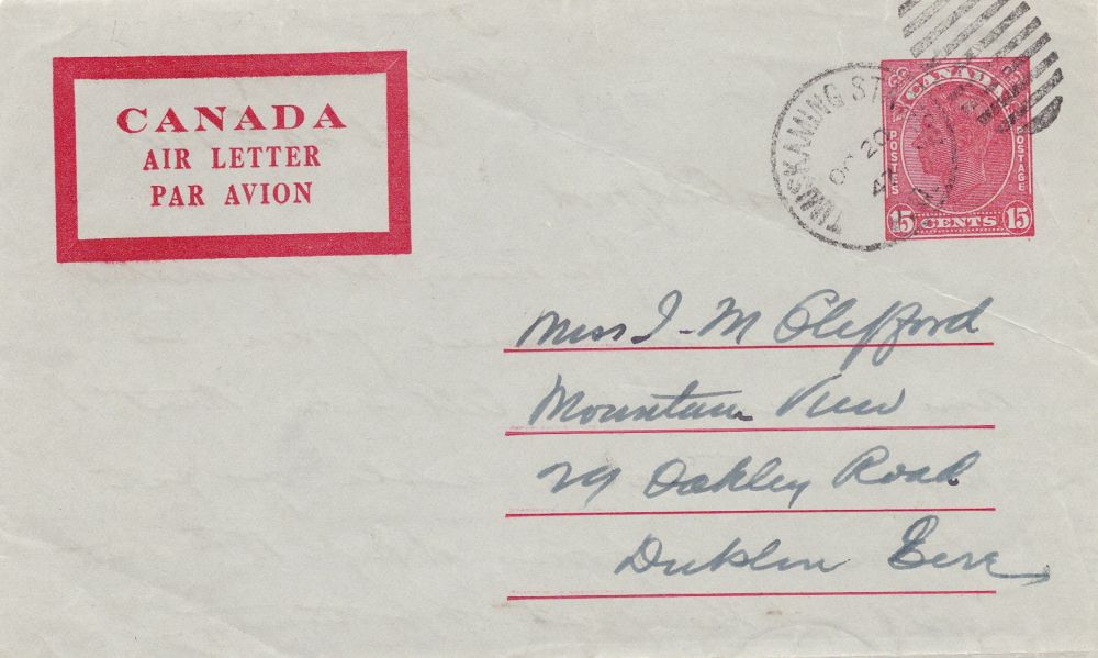 實寄郵簡。標識框與郵資符誌的間距爲65毫米。郵簡寬153毫米(在”SECOND FOLD HERE”處),底寬147毫米。托墨現象较嚴重。郵戳信息:一九四七年十月二十日,TIMISKAMING STATION, QUEBEC. 收信地址:國名未認出(Deutschland??)。應爲早期使用例.