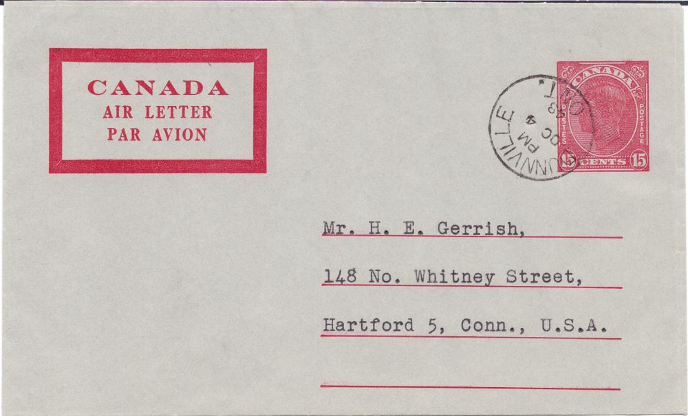實寄郵簡。標識框與郵資符誌的間距爲65毫米,郵簡高271毫米(包括封舌),中寬150毫米(在”SECOND FOLD HERE”處),底寬142毫米。托墨現象輕微。郵戳爲一九四八年十月四日,正好發行一週年。收信地址爲美國。