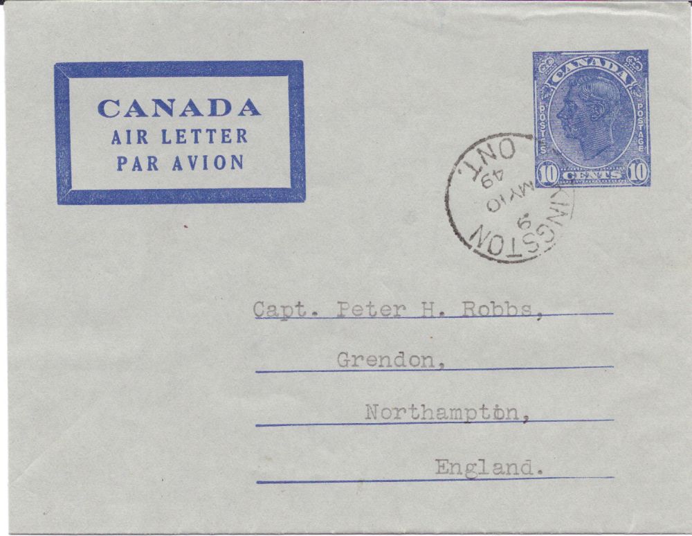 郵政實寄:一九四九年五月十日,KINGSTON, ON, 郵美國。郵資圖尺寸:21x24.5毫米,航空標識框與郵資符誌的距離爲41.5毫米。“NO ENCLOSURE PERMITTED”的長度爲42.5毫米。