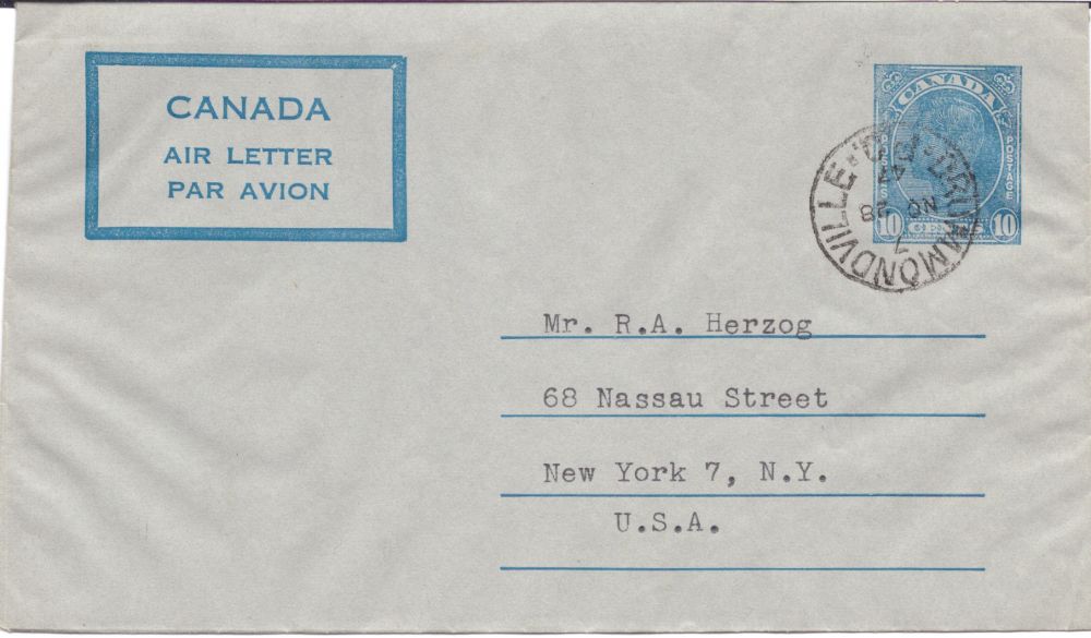 據稱加拿大第一套航空郵資郵簡發行于一九四七年八月二十七日。下面這枚實寄郵簡的銷戳為一九四七年十一月二十八日,由Drummondville, QC, Canada, 寄往New Tirk, U.S.A。此簡內未冩信息,當爲集郵者所寄。此枚郵簡爲顏色變異,淡綠色。不過從印版上看没有缺陷,因此應爲早期的產品。