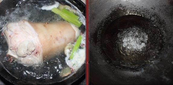 蹄髈是美肤利器,但其粘腻的口感常让人却步。东坡肘子这种经典菜式,虽然貌似哪里都吃到,但要制作完美却很难。记忆中我在眉山的一家餐馆吃到过的东坡肘子,已将粘口的猪蹄髈变成入口即化的软糯酥香菜肴,且菜品色泽红润,本地人说“粑而不烂”,色、香、味、形俱,有老外来眉山,吃后甚至说它可列入世界名菜了。但愿这不是传说。还是先看它的做法吧: