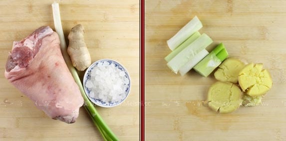 1、准备好所用食材,肘子刮洗干净,也可以用火先烧表皮,然后刮洗干净;葱切段,姜切厚片备用。
