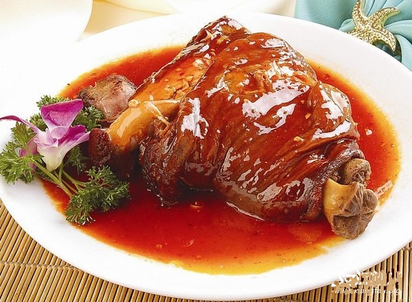 东坡肘子给本来油腻的食材带来清新的口感。这道菜用糖色上色比用老抽漂亮,色泽红润。而且蹄髈本身有油脂,糖色不用油炒,改用水煮法制出糖色来,少了油腻而颜色与油炒一样漂亮,也不再增加油脂,这种做法堪称妙作。有兴趣的吃货不妨一试。