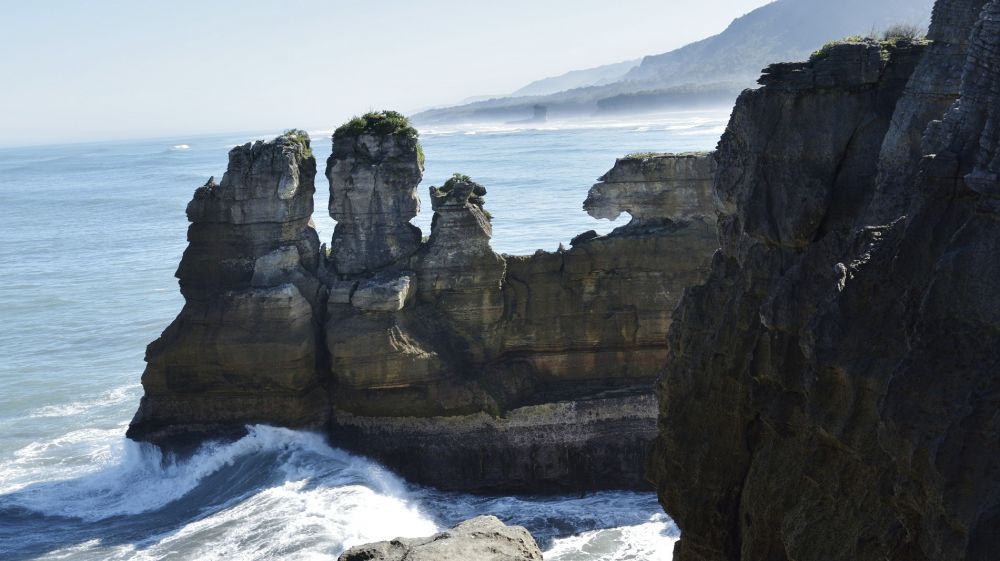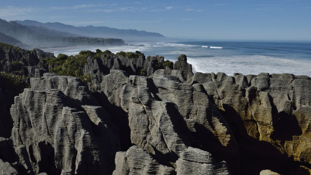 10:00离开千层岩公园,沿着6号公路继续北上。普纳凯基是帕帕罗瓦国家公园(PAPAROA NATIONAL PARK)的一部分,除了海边的千层岩,还可以看到帕帕罗瓦山脉被冰川侵蚀而成的U型山谷,花岗岩和片麻岩砌成的尖峰;可以沿着当年淘金者的古老山路步行,直达五公里长的地下洞穴;可以欣赏刀凿斧峭般的山脊、层层叠叠的亚热带及温带植物、黑色海燕和大斑点奇异鸟。