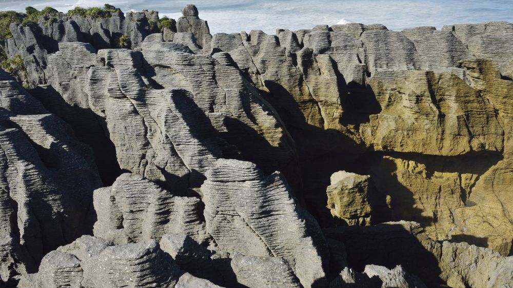 9:00来到普纳凯基千层岩(PUNAKAIKI PANCAKE ROCK),它是这一带海岸层层堆砌的巨大礁石,属于海洋沉积结晶白云岩,有人形象地称其为“大自然的年轮”。它纹理清晰、线条流畅、层次分明,有波有折有起伏,呈灰白或浅褐色的“饼状”。
