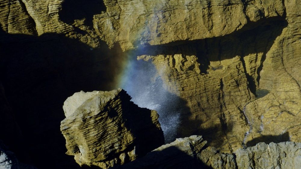 第二、第三个瞭望台:除了层层叠叠的怪石,我更乐意看海,涌流从各个方向绕过礁岩重新汇聚,呼呼隆隆地扑向岸边,顺着一条甬道钻到悬崖环绕的大坑里(SURGE POOL),把剩余的能量一股脑地发泄出来,搅得一湾水开锅般喧嚣。另一股咆哮的水流涌进一个密闭通道,让过剩的能量顺着一个垂直的气孔(BLOWHOLES)排出,激起冲天水雾、画作一道彩虹,号称“烟囱”。上天很公平,今天是日丽但风不和;无雨观景比前两次幸运,但恰逢落潮,海浪的气势没有渲染的那般凶悍,“烟囱”效应不见。