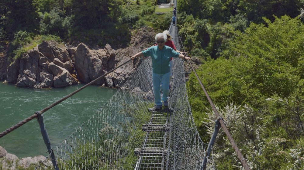 我的表现如此,有恐高历史的老伴儿更不用说,但共同的想法就是不能在姥姥面前露怯。战战兢兢走过去,咬紧牙关走回来。姥姥的表现一如既往,从容、谨慎但绝无退缩,一来一回,为新西兰最长的吊索桥留下了一项新记录。
