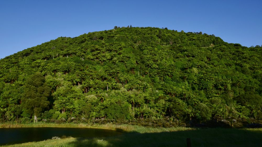 第二段,进入尤瑞瓦拉国家公园(TE UREWERA NATIONAL PARK)山区,用一个字形容就是“奇”。人工松林被茂密的原生态灌木林取代,灌木林间隔出的座座牧场,在墨绿中染出片片葱翠,路边的“金雀” 变成了零星的鲁冰花,崎岖的路随着山的走势突上突下,一个个小角度急弯需谨慎驾驶,两车相遇,靠山坡的尽量靠边,让对方远离悬崖。