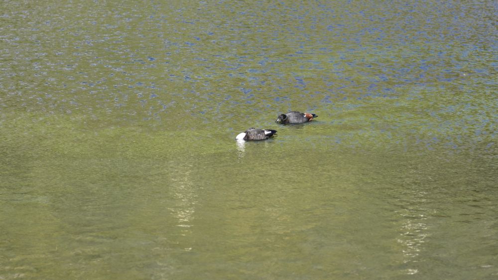 姑娘们成群结队地要去游泳,我挎着相机随她们走下山坡。克林顿河在狭窄的谷底转了半个圈,留住一湾水,被称为MINTARO LAKE。洋妹子不是铁打的,刚湿身就喊叫着爬上岸。这里离冰川源头太近,妹子们没了昨天的潇洒,小胖哥也不敢得瑟,标致姐姐甚至于没脱外衣。人们落败水前时我却另有发现,这里竟然生活着10几只新西兰蓝鸭(BLUE DUCK)。