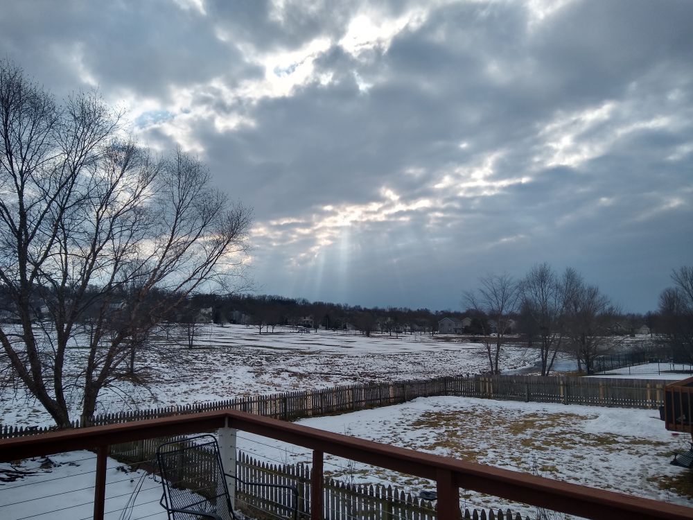 弥漫云天开有洞,斜光似帚扫楼栏。