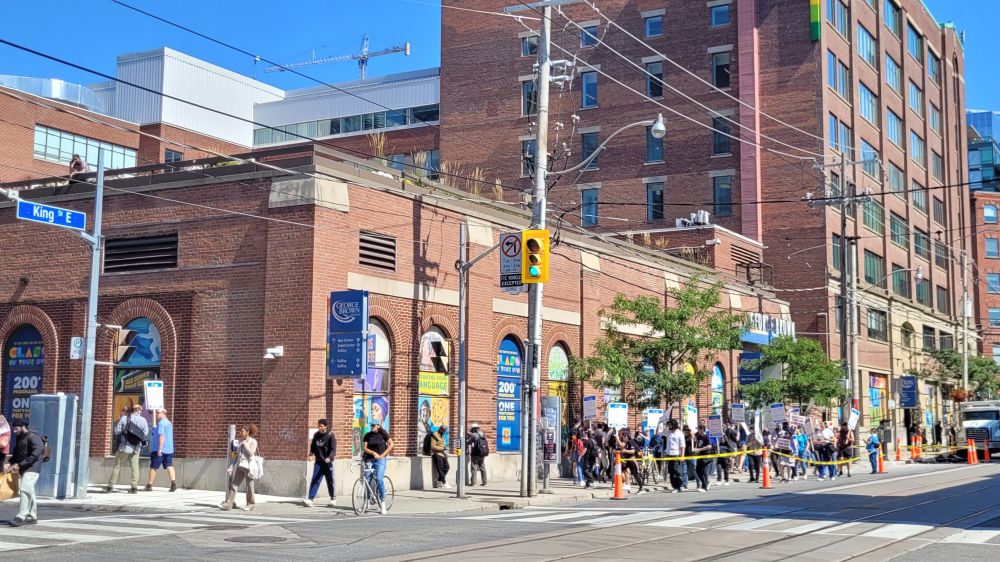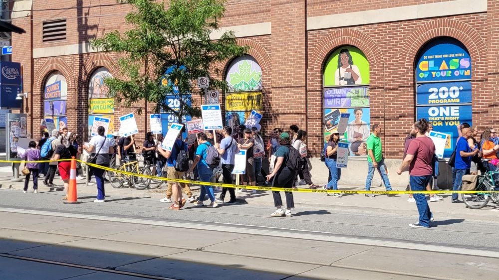 东边街道边有一拨人手中举着形形色色的纸牌,在人行道上转圈子。仔细一看,是 George Brown 城市学院的教职工在罢工游行,要求增加薪资。还是政府机构和公立单位好,可以随便罢工而不担心机构或单位破产,钱不够时增加税就行了。
