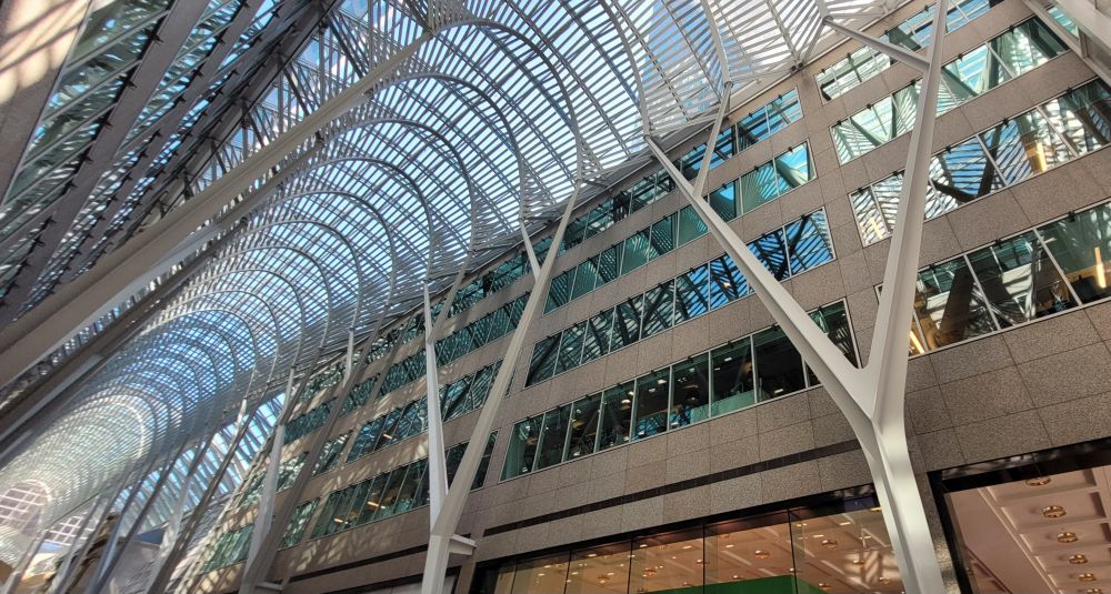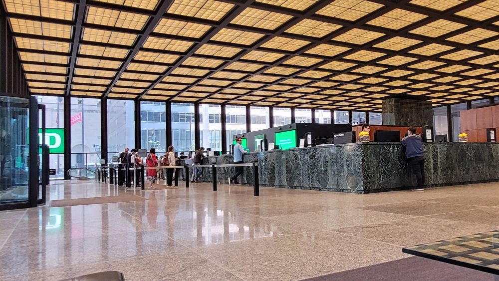 几大银行,只有多伦多道明银行的总部我们进去过。那还是十几年前的事了,那些年几乎每年多伦多门户开放日我们都要找一个地方打卡。几大银行轮流开放,那年轮到道明银行,所以我们才有机会进里面。TD 大楼建成于1969年,是当时多伦多第一座玻钢结构的超高大楼,是那一带的元老。因为大楼是纯黑色调,特別耐久,所以即使半个世纪之后,庄重而仍保绅士之风。