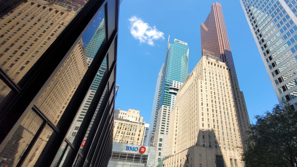 往东两个街区,从 University Avenue 到 Bay 再到 Yonge Street,是多伦多的金融区域,那里有加国几大银行的总部。白色大楼是蒙特利尔银行,黑色是多伦多TD道明银行,丰业银行是红色,而皇家银行更土豪,大楼外墙玻璃摻入了黄金。