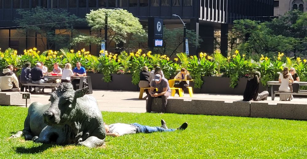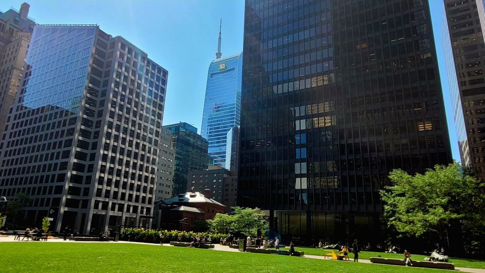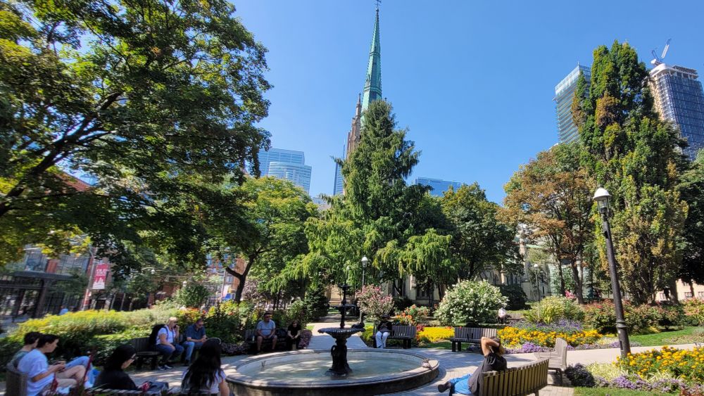 Yonge Street 往东,又是老的城区。那边的第一座地标级建筑,是多伦多圣公会的 St. James Cathedral。最初的教堂建于1797年,但毁于1812年与美军的战争。数次重建之后,1879年最终建成今天看到的形式,迄今将近一百伍十年了。教堂对公众开放,可以自由参观或做礼拜。教堂东边的小公园维护良好,当天气温宜人,不少人很享受多伦多夏天末尾的好时光。