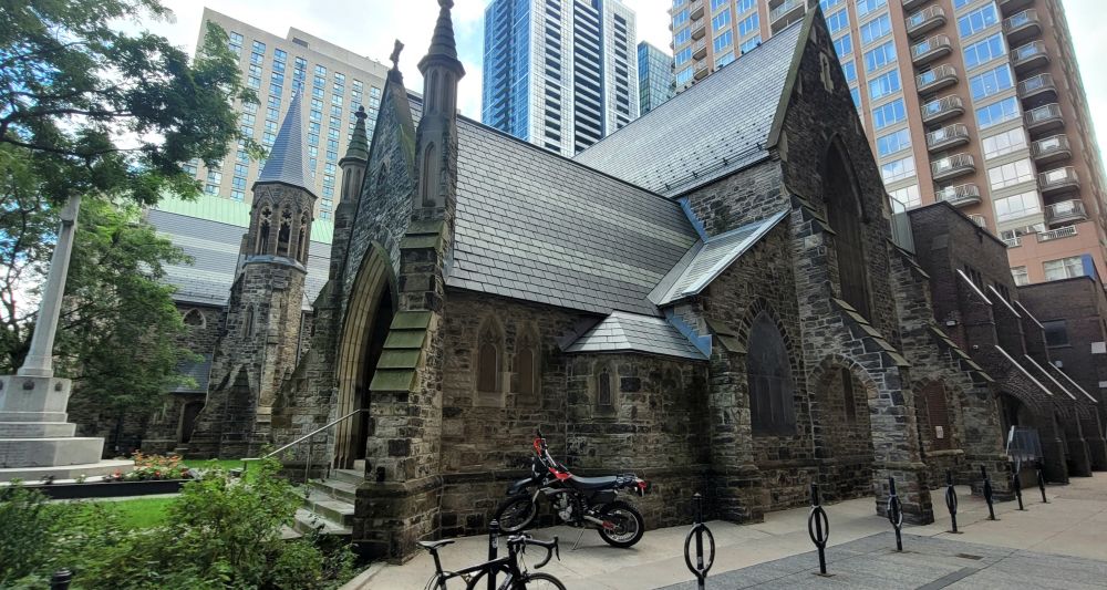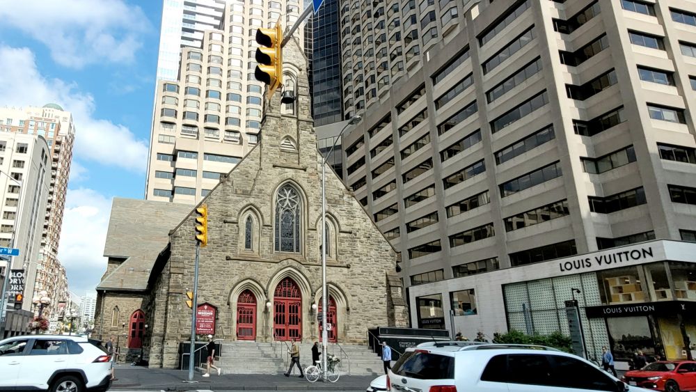 ROM 的斜对面也是一景,街角是一家颇具造型的小教堂 Church Redeemer,而背景则是一栋高层建筑。这座大楼过去是一家五星级酒店,前几年改为高档住宅楼,看网上还有套房出售。