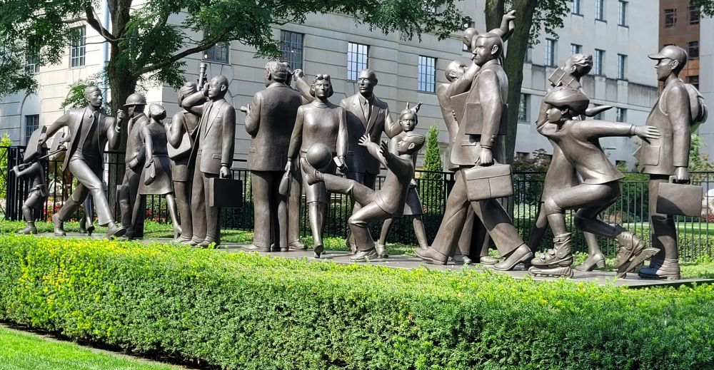 圣保罗教堂对面是保险公司 Manu Life 的总部,其吸睛之处是前面的一组立雕,从左到右有二十来个人物,保险公司各岗位从跑卖保险的到后台支援全都有,算是保险从业人员的一个全家福吧。