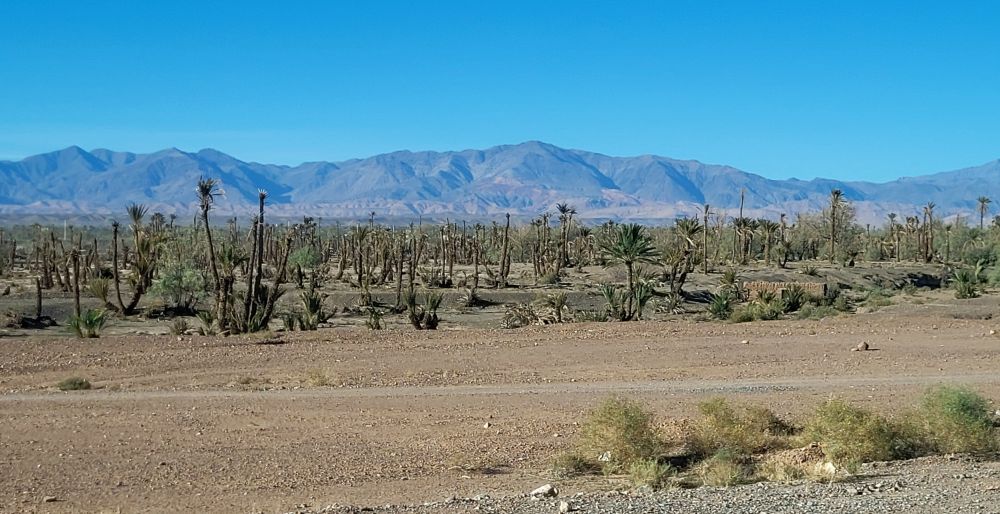 下午的行程中有一段,出乎意料看到一大片绿洲。绿洲生长的,主要是茂密高大的椰枣树。椰枣树很像椰子树和棕榈树,树杆修长,顶上伞形的树冠随风婆娑起舞,都是自己很喜欢的树形。准备摩洛哥的行程时,知道摩洛哥的椰枣很有名,但没想到这么快就看到了椰枣树,而且是成片成片的。椰枣树的水源是北边阿特拉斯山脉上雪化后的山水,所以椰枣树只有山谷才有,而且谷地的土壤也是山上流水带来的。