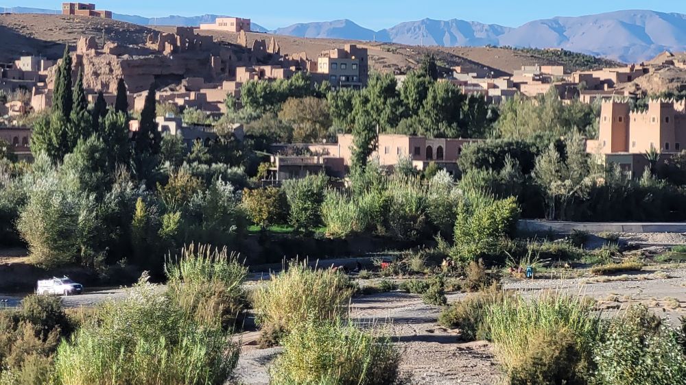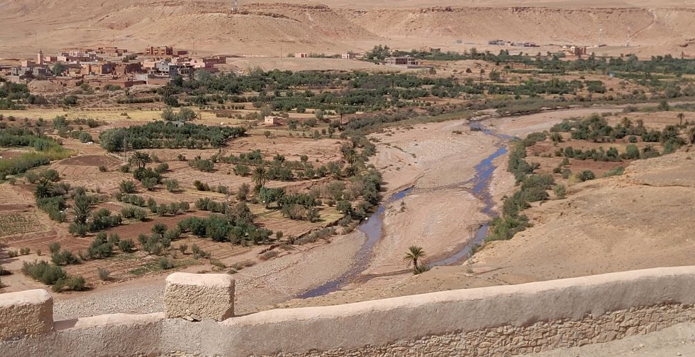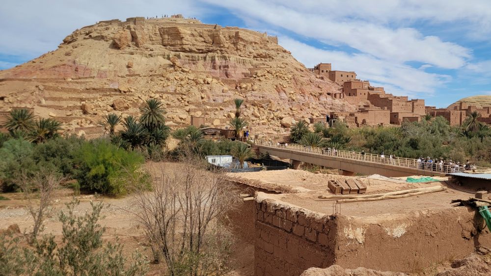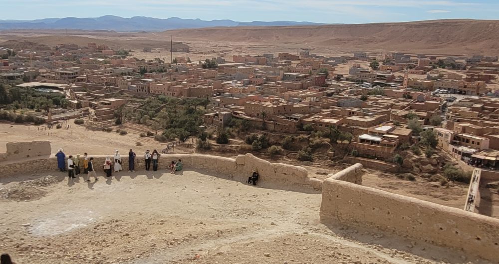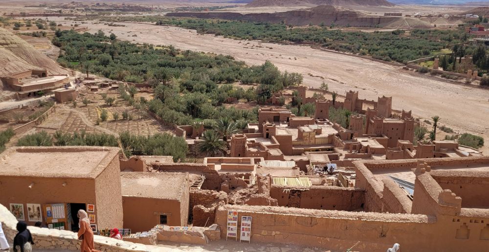 山顶的视野很好,得益于高出周围的高度。往西,河川对面就是新村子,范围比古寨大多了,住户除了古寨搬过去的村民外,应该有不少其它地方迁移过来的。自从1987年艾本哈杜成为世界遗产之后,像我们这样的来访之人络绎不绝,带来了收入,也带来了人口。往北,河的上游是上午我们通过的阿特拉斯山脉的崇山峻岭,山上冬季的积雪春夏融化后流入河中,是下游平川千百年来生命的维系。往东,几百公里远处就是沙漠游的目的地梅尔祖卡,那边是生命的荒漠,但又是一处旅游的胜地。