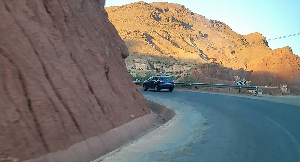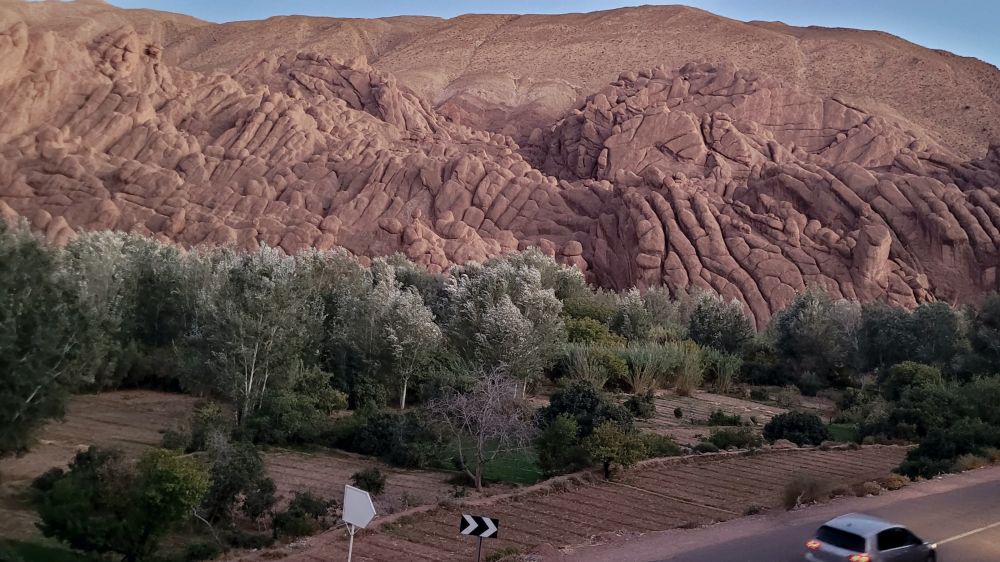 当晚我们住宿之处,阿特拉斯南麓的另一个景区 Dade‘s Canyon 是一个红色的峡谷,在摩洛哥也很有名。接近峡谷时,我们才意识到当天不少时间都耽误在路上了。上午在休息站呆了半小时多,中午购物和午餐又花了两小时,下午又花了半小时在另一休息站。等我们旅游车开到峡谷时,太阳都快下山下了。路上停留至少多花了一个半小时,可能几处都是司机的关系户,停留时间越长游客花钱的机会越多,司机也许可以多得些好处,但我们却错过了观景的黄金时间。