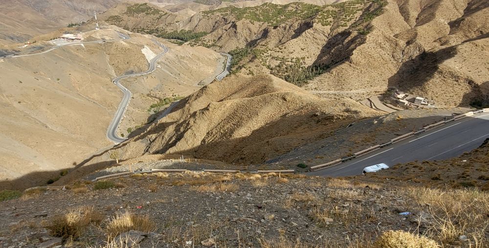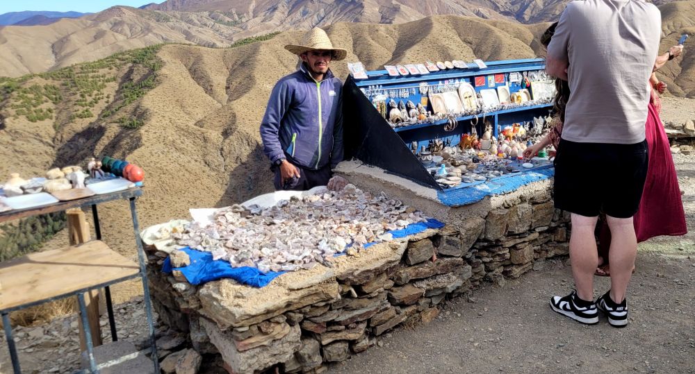 后面的路,完全是山区。一路上车不多,而见到最多的反而是各种厂家的旅行中巴,可见去西撒哈拉沙漠的游人之多,撒哈拉沙漠游应该是摩国的一大财源。我们的旅行车在山中七绕八拐,上午十点过终于翻上了公路的最高点,海拨两千多米的提西卡山口。那里有一个了望点,还有一块平地可供停车。下车后众人免不了拍照打卡,手机时代旅游免不了的一环。山口上还有摊位卖当地人的手工艺品,另外还有各种古海生物化石出卖。亿万年前阿特拉斯山脉是古海洋,所以有很多古海洋化石。