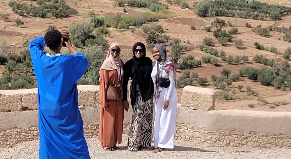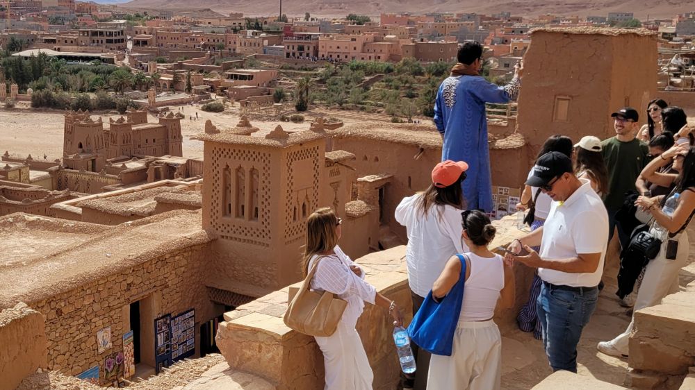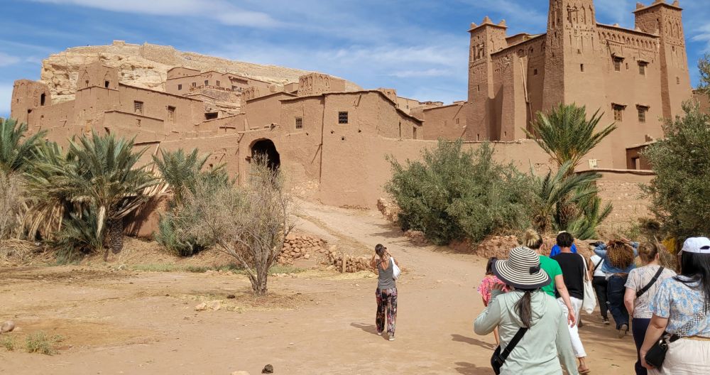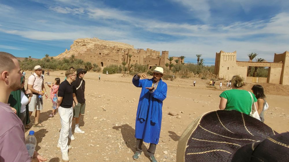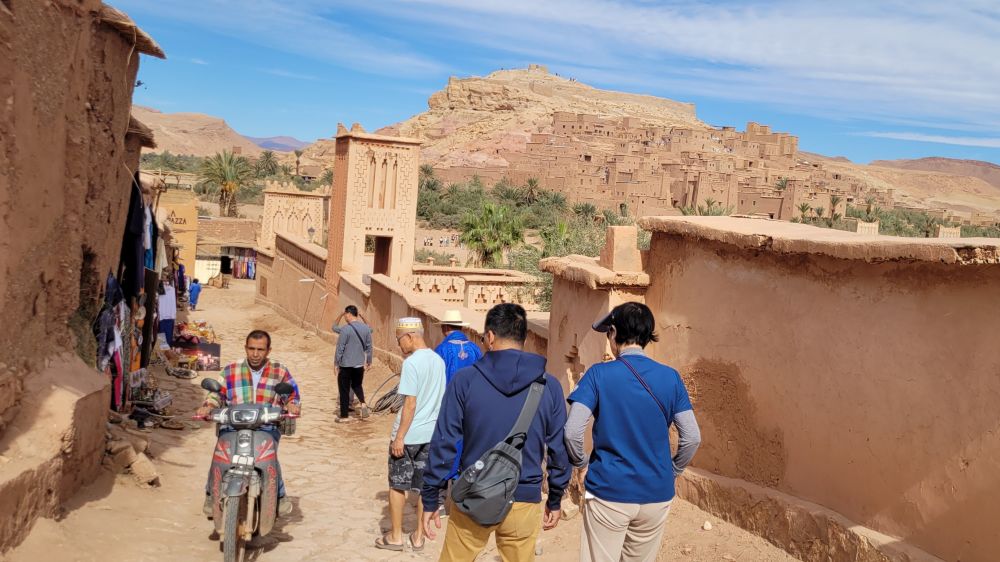 我们的地导莫哈是老江湖,很懂众人的心思。他先让大家在河川上欣赏一阵眼前的美景,然后才开始自己的介绍。他说古寨历史很久,早在公元12世纪摩洛哥南部的穆斯林化的原住民柏柏尔人北上打下了马拉喀什,并建立了自己的穆瓦希德王朝。为了保持首都马拉喀什与南部根据地的联系,还历尽艰辛打通了穿过阿特拉斯山脉的通道。中途的艾本哈杜依山傍水,自然成了一个保护驿道的堡垒,同时也是一处很好的驿站。他还说自从几十年前新公路开通后,寨子大多数人都搬到对面的新村子,只剩下八户人家还在古寨里面坚守。