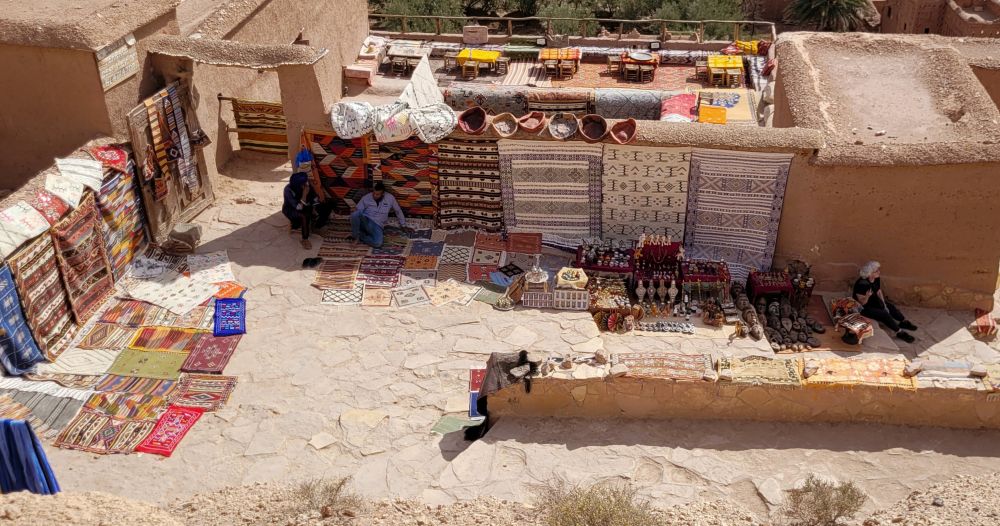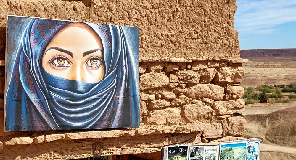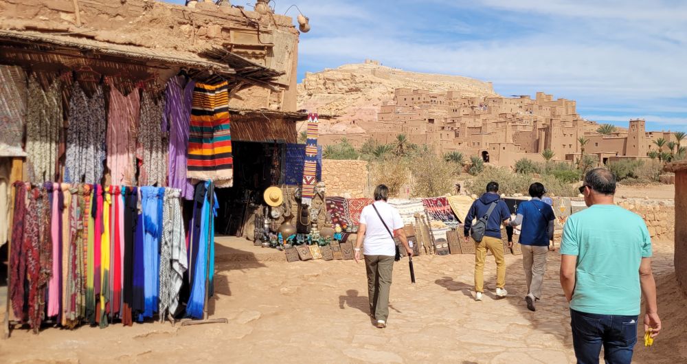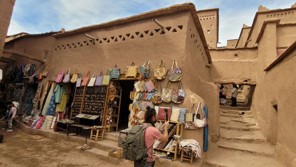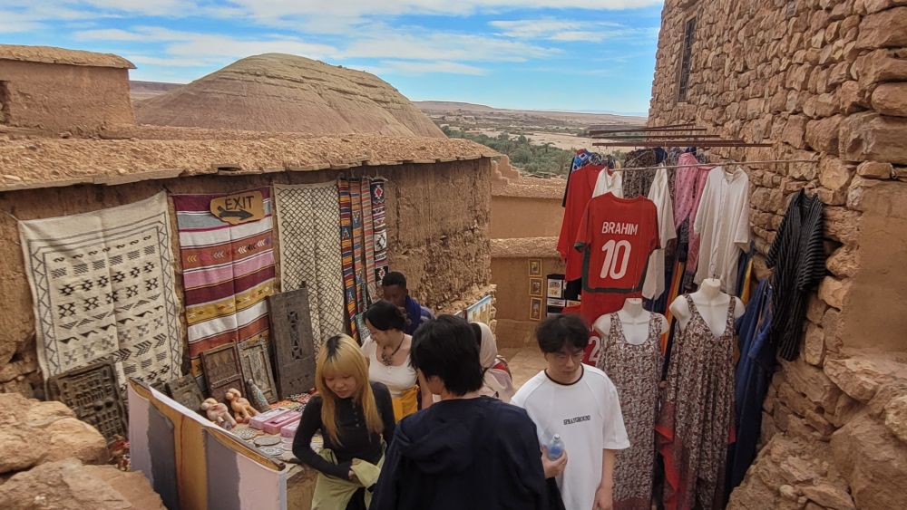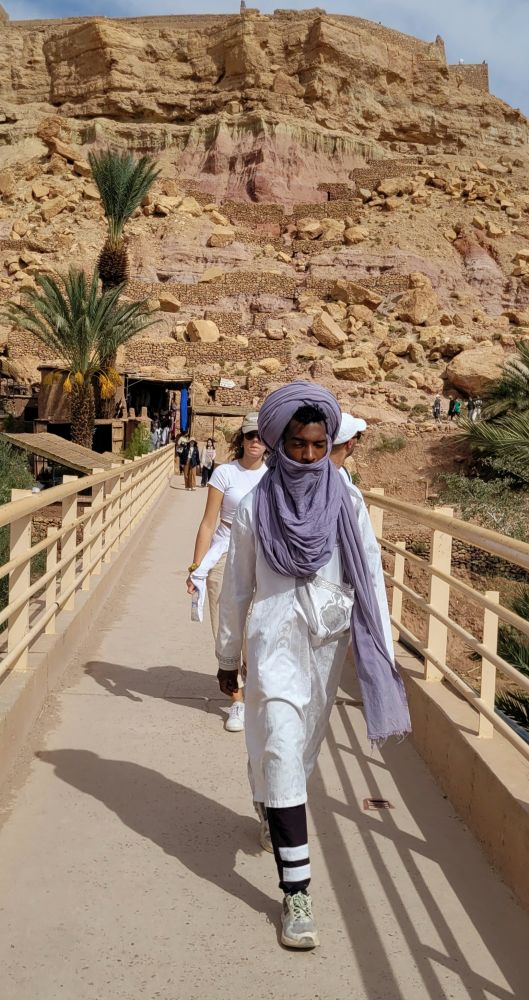 从山顶下来和地导莫哈汇合后,他带着我们一行人走左边的出口离开古寨。这边跨河有一道水泥长桥,但只供行人通过,车辆禁行。河这边有一排商店,莫哈领着众人去了其中一家,说让大家体验体验柏柏尔的夕文化。我们的三日团不包含购物,但各地导游还是会以文化体验的名义带着逛当地的店。莫哈他很有一套,连哄带骗说离开艾本哈杜后都是荒漠,这里是最后的购物之地,后面再也买不到柏柏尔人头巾长袍供骑骆驼时拍照。他这一套还真有效,团里面果真有人买了柏柏尔头巾,其价格比马拉喀什贵多了,我们其他人则陪着多呆了几十分钟。