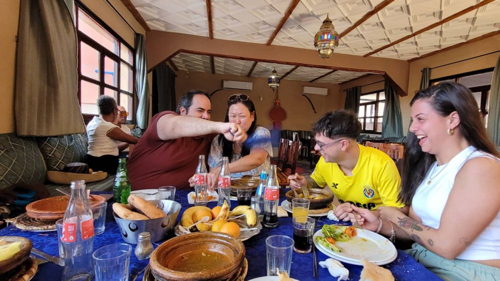 商店是一个坑,后面的午餐是另一个坑。莫哈带我们去了一家很大的餐馆,当时里面挤满了人,嘈杂得像一个集市。同行几个欧洲带的游客这种事情见得多,对司机说他们自己另找去处,其余十人像我们怕麻烦则留了下来。这家餐馆确实一个坑,菜单贵多了。就拿摩洛哥的特色菜塔吉锅来说,马拉喀什只要60到80迪拉姆,而这家餐馆要价120,几乎翻倍。