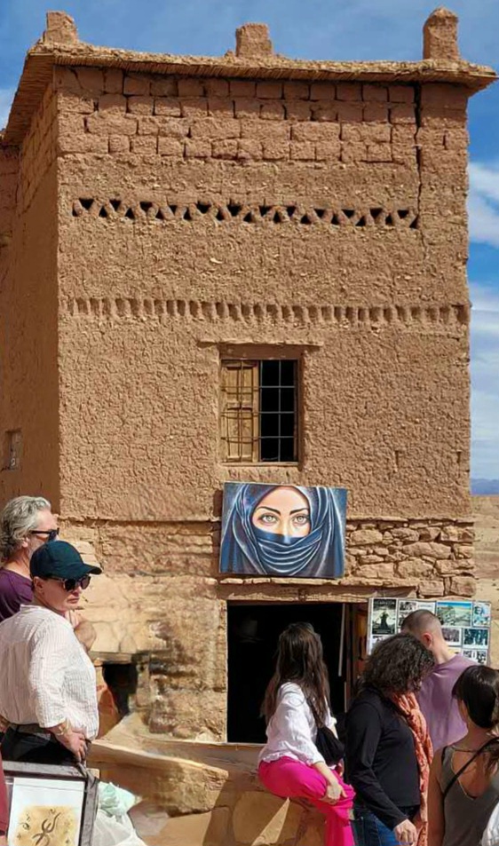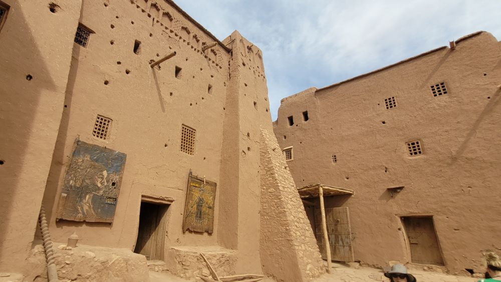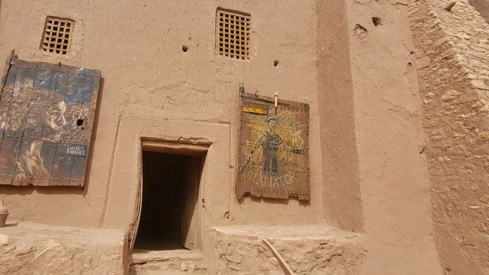 古寨极富特色,自然会吸引到长于猎奇的好莱坞人的注意,一众导演在这里拍了不少大片。很早在1985年,这里就是夺宝大片”尼罗河的珍宝”的外景地之一。后来2000年的”角斗士”也选了这里的场景,所以寨子大院一侧墙上还有主演Russell Crowe 的大幅绘画。墙上另一侧的大幅绘画,则是美国电视连续剧”权力游戏”中的女主角。可谓古寨因名片而出名,而名片因古寨而生辉。