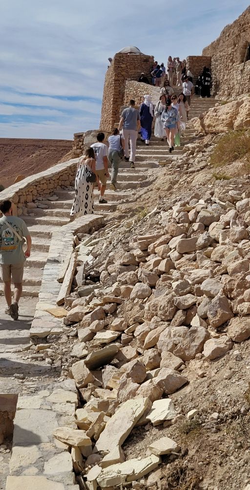 再往上,是光零零的岩石。最顶上是古时防卫的城堡,多年废弃之后,现在只剩下几段残留的城墙。地导莫哈说山顶以前有一个邮局,可以买纪念明信片发往世界各地,但几年前疫情期间因游客大减而关闭了。莫哈给众人二十分钟上山顶观光拍照,然后再下来汇合。