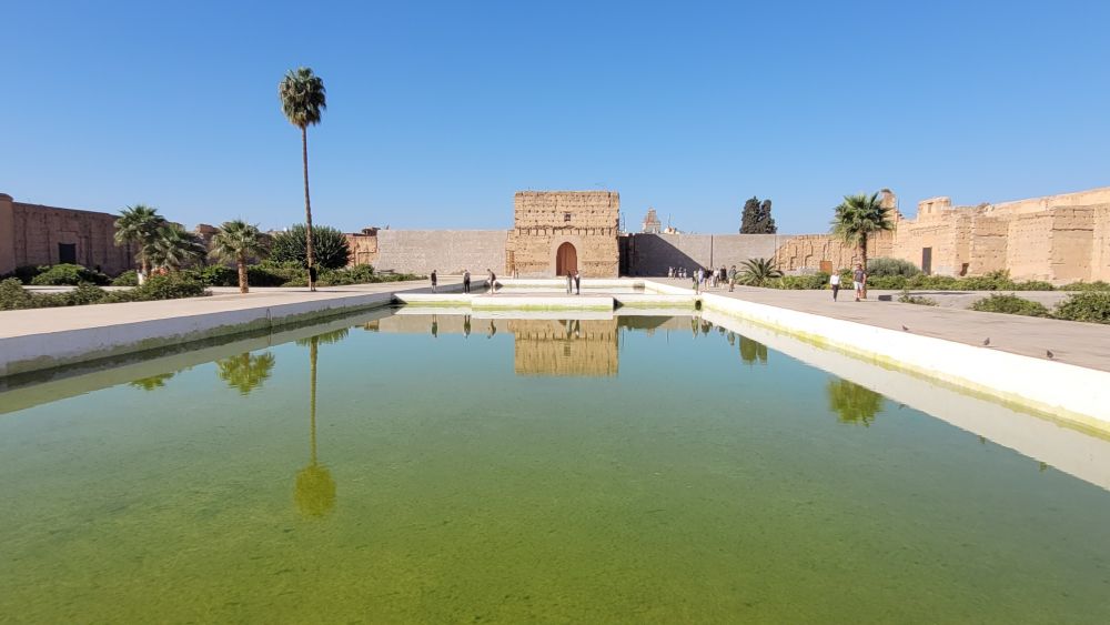 巴迪故宫现在只剩下残墙断壁,其主体是皇宫原来的皇家庭院,规模巨大,可能不比足球场小。庭院南北两侧是园林,遍植的桔树挂满了黄澄澄的金桔。庭院中央自东到西是一个长形的倒影池,水池中碧水如镜,反射出西边尽头原宫庭主体建筑的倒影。倒影池一分为二,中央原来可能有一个亭台,但现在却成了打卡之地,拍出来的片子成了马拉喀什的名片。