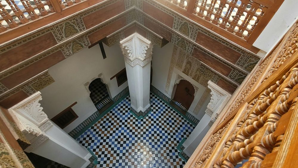 正门里面就是宗教学院的主庭院,中央是喷水池,两侧柱廊的上面就是学生们的住所,同时也是他们自修的学习室。整个庭院就是一件工艺作品,上部及至屋沿是精美的木头雕刻,墙壁中部是伊斯兰艺术常用的石膏模塑,而墙裙照例是图案精美的玛赛克。同样是室内装饰,中国传统的是通透的木雕窗棂,西方用彩色玻璃,而伊斯兰国家更喜欢各种平面图案,有种几何和数学的美。