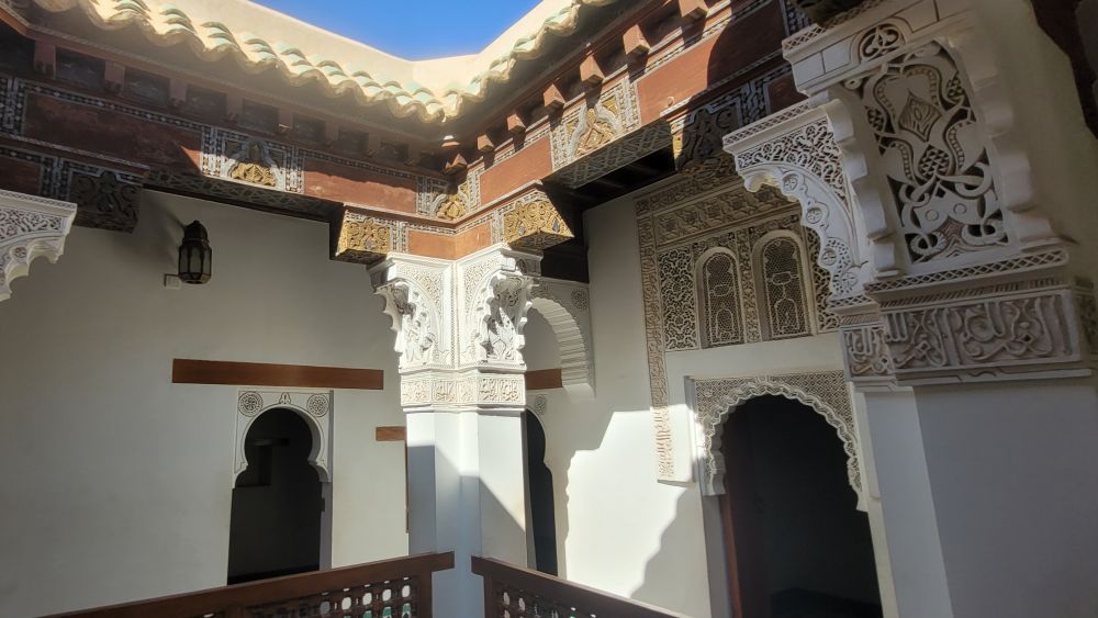 和马拉喀什的其它高门豪第一样,巴西亚正门里面也是会客花园,种植的桔树两百年下来成了参天大树,高齐二楼的屋顶。花园四侧是客厅,书房及艾哈迈德的卧室。他后来失势后房內的贵重家俱,收藏的珠宝均被收缴充公,现在能看到的只有画梁雕栋的柱廊和精美的屋顶。四周的柱廊横楣很多都是峰巢状雕刻,和几年前去西班牙旅游时在格拉纳达摩尔皇宫看到的同出一门。据说巴西亚的首席建筑师本马基之前在格拉纳达生活过,所以庭院有摩尔皇宫的痕迹也好理解的。