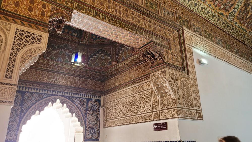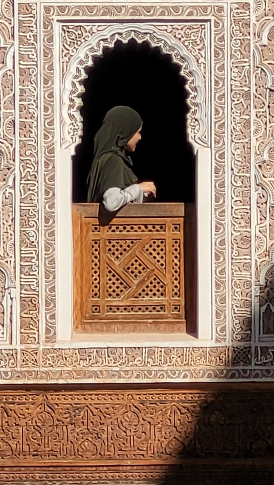 下午掉转方向,去德吉玛市场北边的另一个古迹,本优素福伊斯兰学院 Ali Ben Youssef Madrasa。这所宗教学院也很有来历,当初是由穆拉比特王朝的苏丹阿里本优素福建立的,至今约九百年了。这所神学院是摩洛哥境内不多的几处向非穆斯林开放的宗教场所,只像征性的收费20迪拉姆,约合3加元。