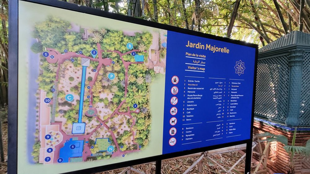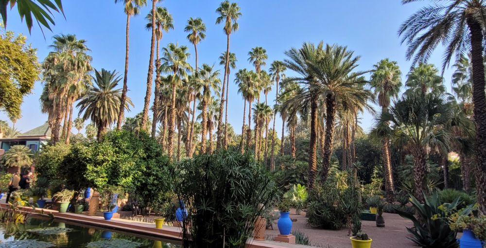 前面看的三处古迹都是摩洛哥的伊斯兰文化,但马拉喀什有一处景点却和法国有关。上个世纪摩洛哥曾由法国代管,一直到1956年重获独立。那段时间不少法国人前往定居,其中有一位法国艺术家雅克马约克也来到马拉喀什,还在古城北面的新区买了一块地,并兴建了自己的私家花园。花园除了各种珍稀热带树木外,房屋和廊柱都上了一层独特的蓝色,称之为”马约尔蓝”。