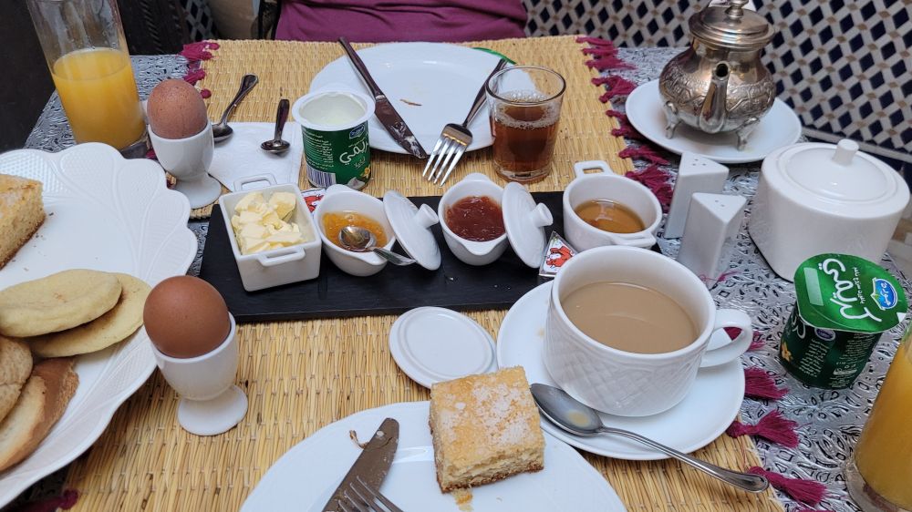 当天就餐的就我们两人,清清净净的,我们俩独享整个小庭院。旅店小哥说同时还有其他人入住,但后来从早到晚从没碰过面。估计时间都安排得紧凑,来去匆匆,所以难以碰上一面。早餐主要是面食和甜点,颇合我们的口味。我们的口味偏清淡,早餐很少吃咸的,所以他们的早餐很对我们的胃口。摩洛哥的桔子很有名,早餐的桔子汁很好喝。