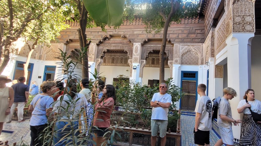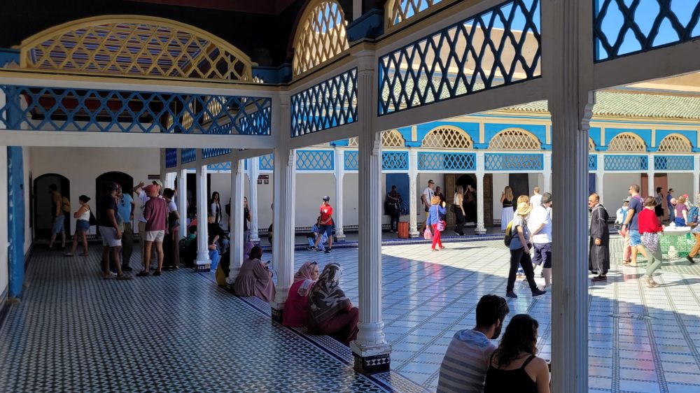 离开巴迪故宫后,我们俩又步行去附近的另一处古迹巴西亚皇宫 Bahia Palace。其实这不是一座真正的皇宫,而是阿拉维王朝19世纪的苏丹哈桑一世的重臣希穆萨的府第,然后由其子布艾哈迈德继承。艾哈迈德随哈桑一世远征,当时他已是宰相,途中哈桑一世暴亡后他扶王子阿齐兹上位苏丹,自己做摄政王。掌权后他继续扩建父亲留下来的豪宅,规模向皇宫看齐。他有4个妻子,24个妃子,每个妻子各安排了一个豪华大屋,而妃子们则两人共处一室,整个庄院共有150多间客厅,卧房及浴室。