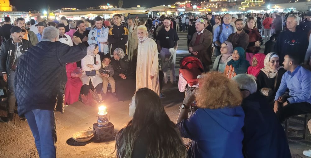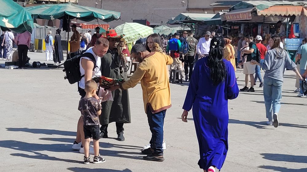 说到马拉喀什,都会说到德吉玛广场 Djemaa el-Fnaa。德吉玛是一个广场,但更是一个集市,天天开集,晚上更加热闹。广场上有各种摊贩,卖水果的,卖小吃的,还有卖手机卡和沙漠旅游的。还有形形色色的各种表演,唱歌的,跳舞的,以及耍蛇耍猴的,既混乱又热闹,感觉走入了一千零一夜中的古市场。游人许多来这里,不是真想买东西,或者看各种杂耍表演。他们很可能像我们一样,只想在千零一夜书中的意境中生活一下,那怕只是短短的一两天。