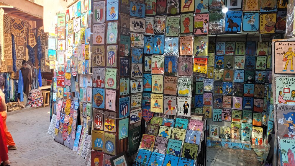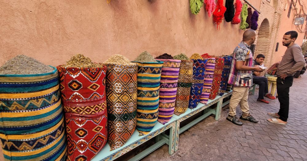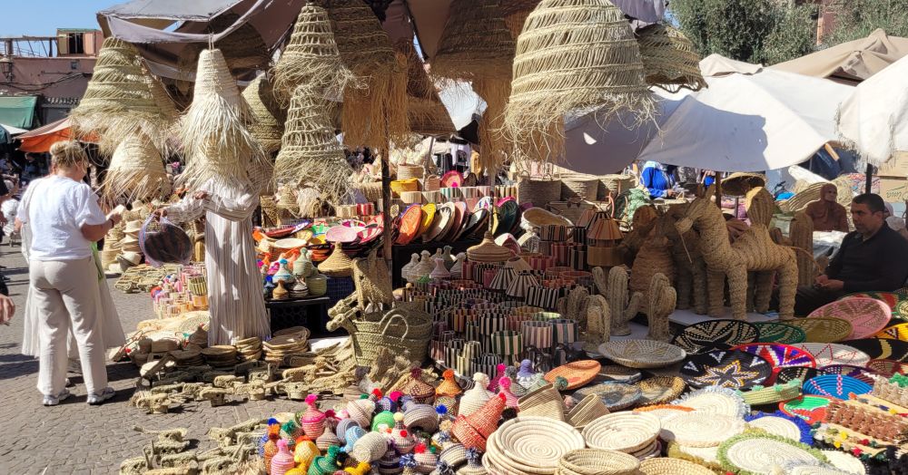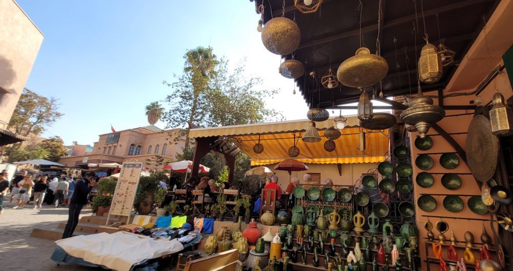 编织市场过去是陶器和毛皮市场,其中一个陶器摊铺外面铺天盖地,摆满了烹制摩洛哥名菜塔吉锅的用具陶器锅,质地和家乡附近陶器之乡安富镇生产的陶器很相似。家乡也是红土地质,但不同的是四川雨水丰富,山川林木葱笼,而马拉喀什是干旱气候,满目除了红色土壤就是红色山脉。