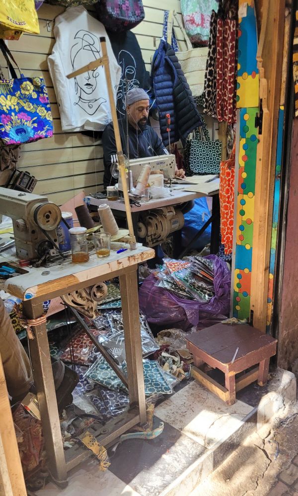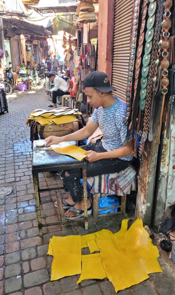 小街背后的小巷,又是另一幅景象。里面有不少小作坊,都不大,大多数都只能容纳一个人在里面制作。制作的有老有少,但都是男的。摩洛哥在穆斯林国家中算开明的,但毕竟是穆斯林国家,所以凡是要和外人打交道的事情,女人都很少露面。