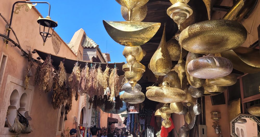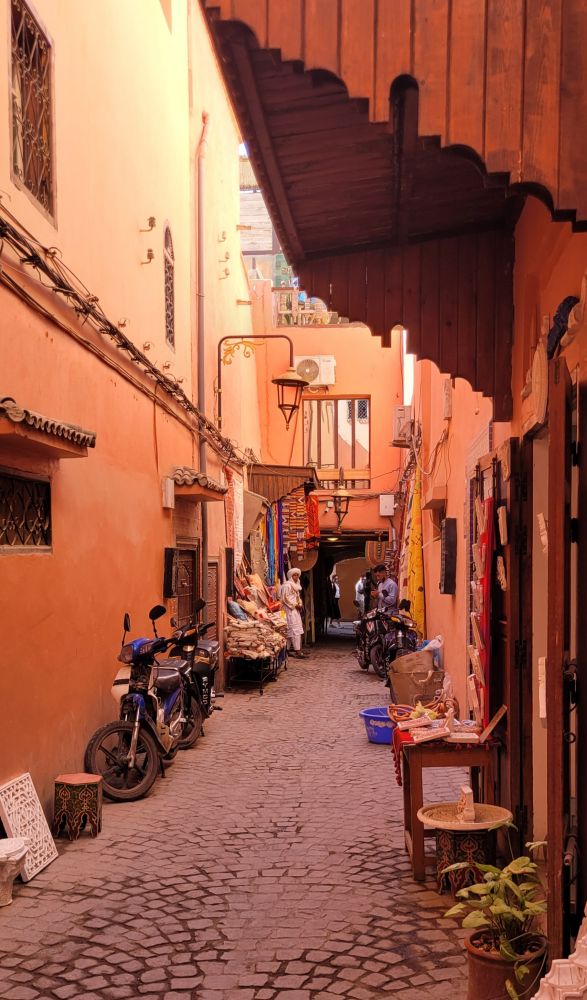 德吉玛广场形如一个多边形,每边都有小街小巷通到老城深处,那些街巷里面才是马拉喀什最迷人的所在。小街有几百年上千年的历史了,街面不大,两边都是形形色色各种各类的小店,卖手饰,柏柏尔头巾,阿拉伯灯饰,应有尽有,只要能想得到的,这里就有店铺出售。小街只能过手推车或小驴车,人来人往,总会有人挑选一两件东西带走。