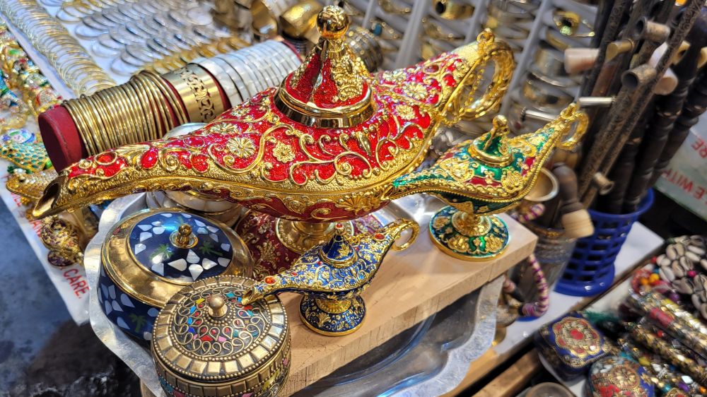 转弯抹角,我们又来到了另一个小广场。广场对面是一家露天咖啡馆,依稀中我们好像又进入了另一部好莱坞老片中的场景,既熟悉又陌生。有了一些年纪之后,再熟悉的事物记忆中也是模模糊糊的,像是年深日久的老相片。市场过去是一家山货店,卖各种各样的摩洛哥调味品和香料。山货店的货品很丰富,但更有特色的是盛放调料香料的器物,每一件都像是工艺品,山货店也像是一处工艺品陈列馆。