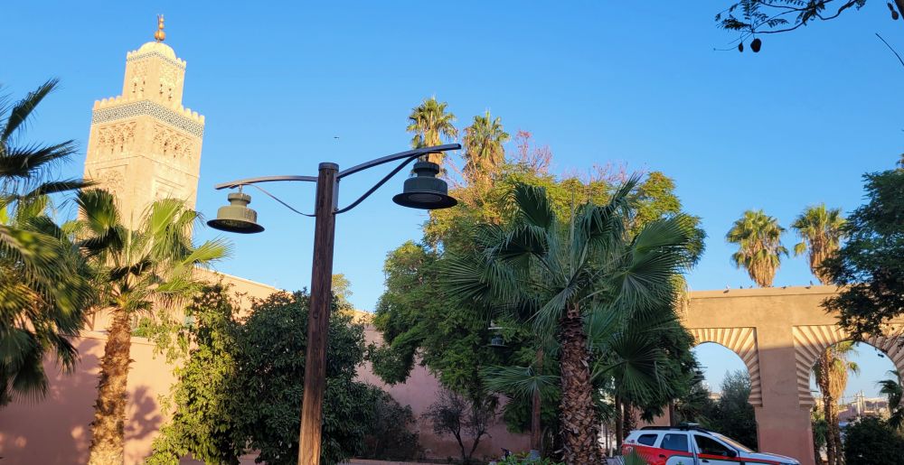 首先要去的是老城的地标库图比亚大清真寺 Koutoubia Mosque,是老城里面最高,也是最古老的建筑。清真寺建于公元1147年,当时是穆斯林化了的柏柏儿人穆瓦希德王朝。世界上很多地方清真寺的宣礼塔都是圆柱形的尖塔,而库图比亚的宣礼塔则是方形的,影响所至,摩洛哥全国各地宣礼塔也是同一种型式。