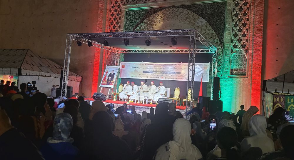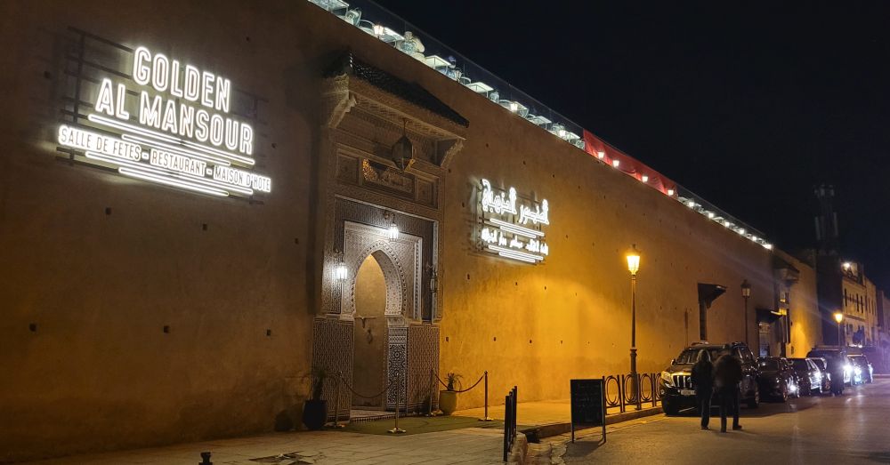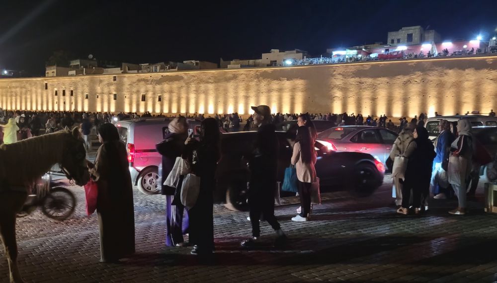 晚上我们又回到哈迪姆广场,这时广场上人气旺盛多了,但主要是游人,卖东西的摊位并不多。那天好像是当地什么节日,四周老城墙都开了黄色的射灯,黄色的光色烘托出浓浓的节日气氛。城墙的曼苏尔拉莱吉主城门还搭了一个舞台,当时有一个本地的民族乐队在台上演唱。乐队的队员全身一袭白色的阿拉伯服装,头戴红色阿拉伯小帽,唱得也很投入,只是听不懂在唱啥。