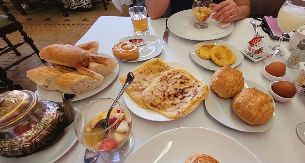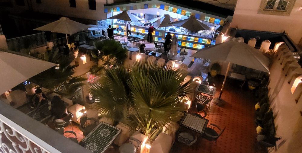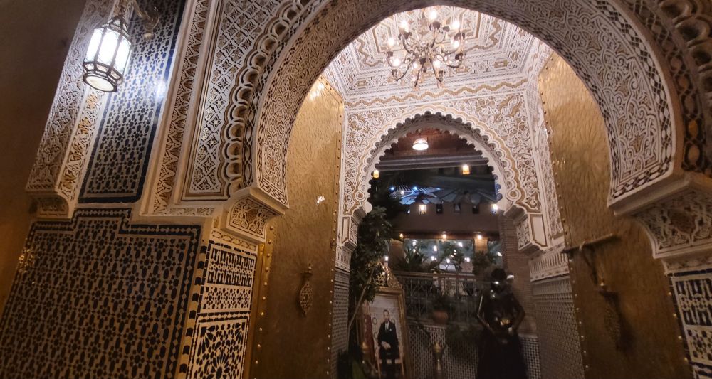梅克内斯我们的住处是老城边上的一家酒店,靠近老城有名的哈迪姆广场。一边是梅克内斯老城,另一边是巨大的皇宫,中间几个花园四周过去应该是富有人家的宅院,现在改成了各种旅游酒店。酒店虽然不大,但內部陈设很有品味,有一种置身于城堡酒店的感觉。酒店包早餐,服务也很周到,还是那种老派酒店的风格。