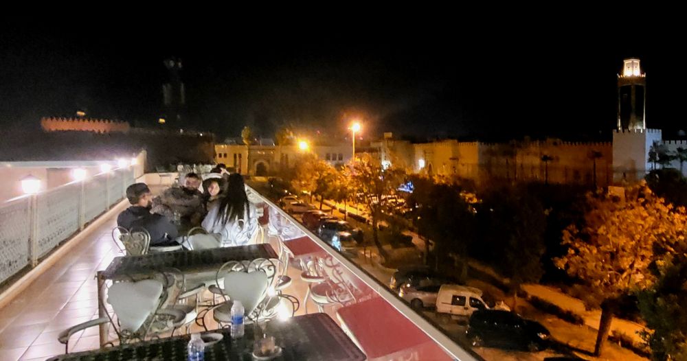 我们入住的酒店左边是一家餐馆,门面很大,时常有人进出,晚上我们决定就上那里就餐。餐馆有三层,底层是茶座和咖啡馆,20迪拉姆一杯茶或咖啡可以呆上一晚,吸引了不少当地小年轻喝茶聊天。二楼和三楼露台都是餐馆,我们选择了三楼露台,那里可以打望下面公园的夜景。