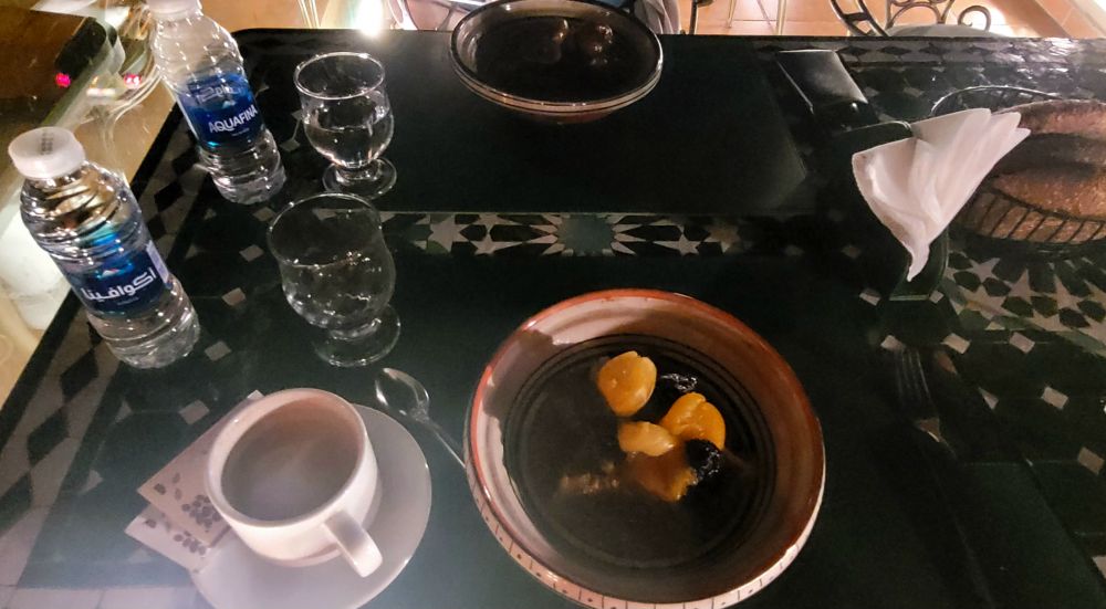 太座和我要的都是塔吉锅,她的是羊肉,我的牛肉,价格都不贵,110迪拉姆,加上饮料后才40加元左右。味道也不错,当然比不上菲斯那个家庭餐馆好,但也过得去。帳单来后看了一下没算小费,我们决定给一些,摩洛哥那边小费是可给可不给。交钱时收费的小哥补充了一句说 no tips,当时我误会成不收小费,所以就打消了绐小费的念头。事后我们俩再一细想,也许小哥当时是在強调帳单沒加小费,我们如愿意可再补上,而我们误会成了不收,导致小哥少了一笔收入, 想来有些对不住他。
