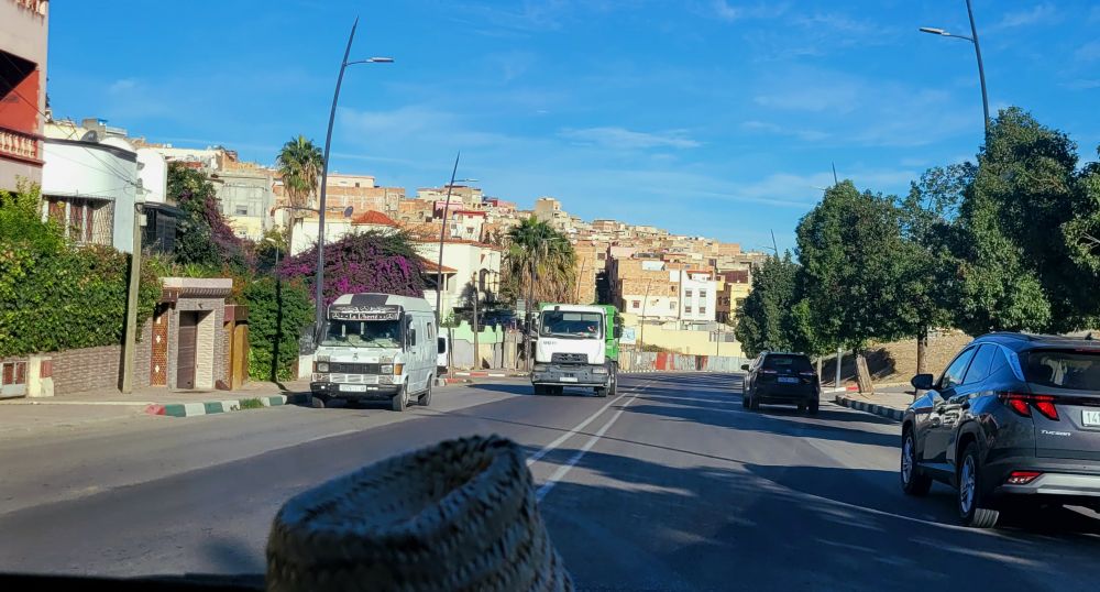 去伊德里斯镇有公交,但要转车。另外就是私人小巴拼车,这在摩洛哥很普遍,当地去几十公里以外的小镇大多拼车。拚车点在新城那边,先要打车过去,好在不太远,15迪拉姆。拚车点是城内一个小停车场,依次停排到好几辆小巴。小巴有三排座位,除驾驶外还能七位乘客。去伊德里斯的小巴里面已经有三位乘客,加上我们俩后驾驶觉得人数足够了,他没再等就开车上了路。