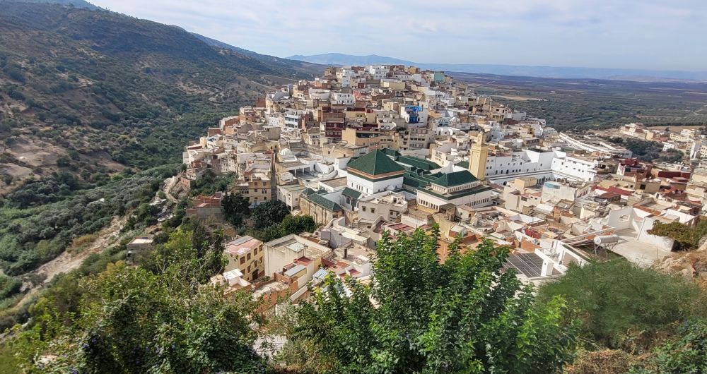 当天游览的第一站是有摩洛哥王朝摇篮之称的穆莱伊德里斯 Moulay Idriss,在梅克內斯北面二十来公里。穆莱伊德里斯镇外还有一处古罗马遗迹,八世纪末穆斯林什叶派阿里的后人伊德里斯在麦地那权斗失败,穿过埃及和突尼斯来摩洛哥后就是看中了这里的风水,选择在此落脚。后来他因为是阿里后人而被当地柏柏尔穆斯林推举为伊玛目,并在公元788年建立了自己的政权。