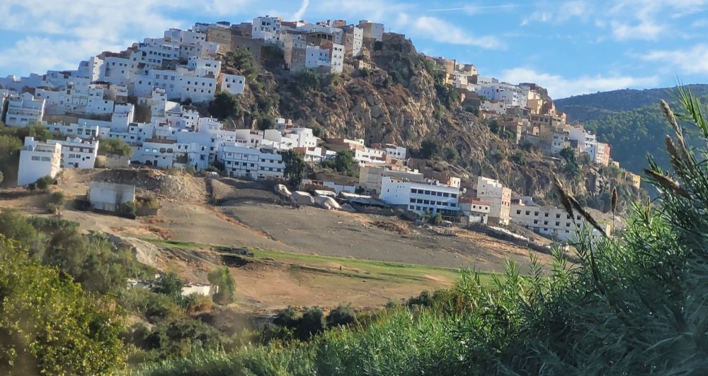 最初一段在城里,两边的房屋很破旧,感觉不如菲斯那边兴旺。出城后不久是丘陵地带,一路都是起伏的缓坡,坡上是各种杂木,虽然说不上郁郁葱葱,但至少不像南边马拉喀什全是裸露的岩石。开了大约半小时左右,前方出现了一座不太高的山丘。山丘上从头到脚,座落着大大小小的白色房屋,在一片绿色山峦中特別引入注目。不用驾驶介绍,我们也猜到那里就是目的地伊德里斯小镇。