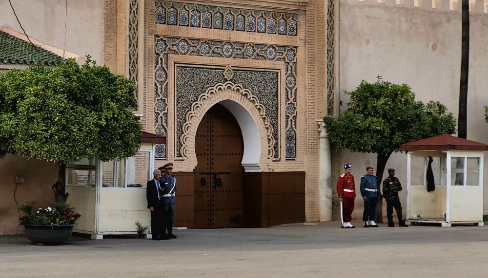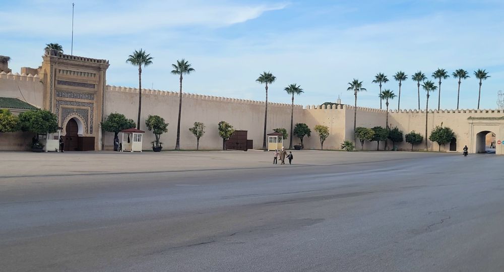 梅克內斯皇宫很大,但也不允许入内参观,游人只能在大门前面拍照留影。这个皇宫国王一家不常来,所以大门时常紧闭,但尽管如此大门还是有门岗守卫,而且宫墙四周也有卫兵巡逻。皇宫旁边还有一个宽阔的皇家高尔夫球场,门前也有守卫,这两个地方加起来的开销应该不小。